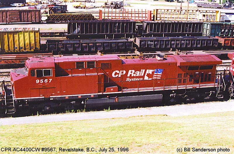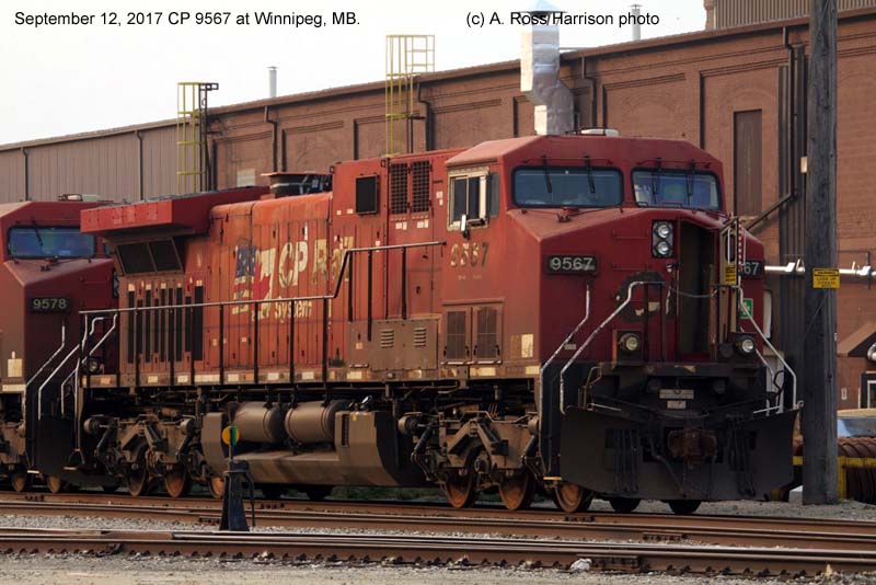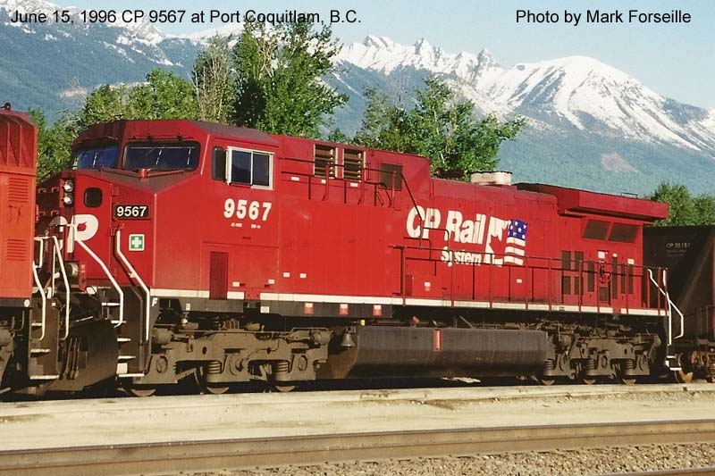 Other Photos (chronological) : 1. CP 9567 at Golden, B.C., painted in the CP Rail Dual Flags paint scheme. Photo by Mark Forseille, 1996; 2. CP 9567 at Revelstoke, B.C., painted in the CP Rail Dual Flags paint scheme. Photo by Bill Sanderson, 1996; 3. CP 9567 at Winnipeg, MB., painted in the CP Rail Dual Flags paint scheme. Photo by A. Ross Harrison, 2007; 4. CP 9567 at Winnipeg, MB., painted in the CP Rail Dual Flags paint scheme. Photo by A. Ross Harrison, 2017; 5. CP 9567 at Winnipeg, MB., painted in the CP Rail Dual Flags paint scheme. Photo by A. Ross Harrison, 2017; 6. CP 9567 at Winnipeg, MB., painted in the CP Rail Dual Flags paint scheme. Photo by A. Ross Harrison, 2017; 7. CP 8052 at Coquitlam, B.C., painted in the CPR Beaver II paint scheme. Photo by Mark Forseille, 2019.