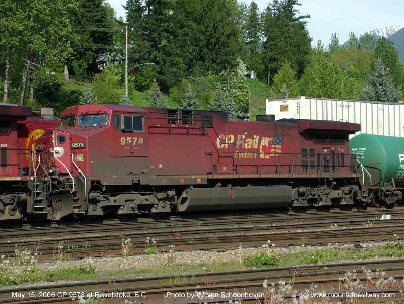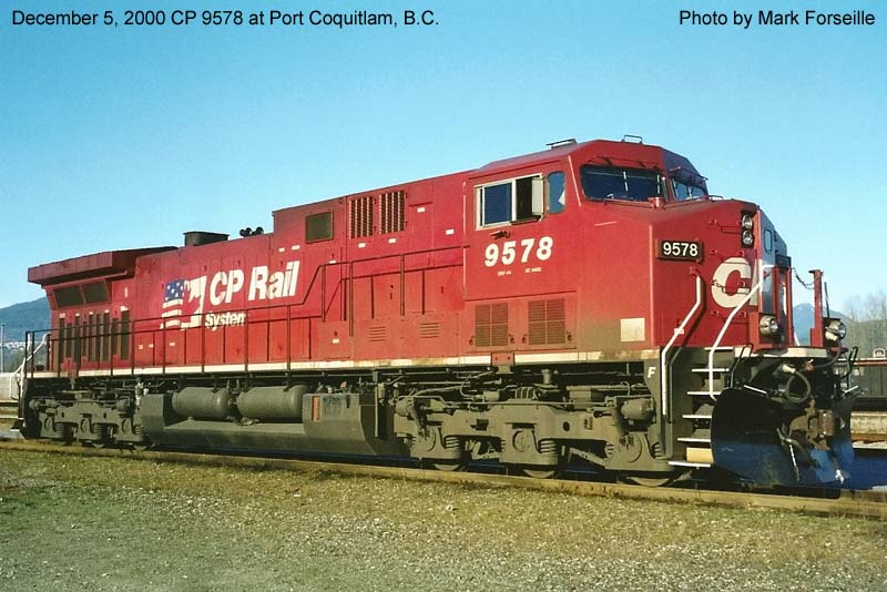 Other Photos (chronological) : 1. CP 9578 at Port Coquitlam, B.C., painted in the CP Rail Dual Flags paint scheme. Photo by Mark Forseille, 1999; 2. CP 9578 at Revelstoke, B.C., painted in the CP Rail Dual Flags paint scheme. Photo by Wilco van Schoonhoven, 2006; 3. CP 9578 at Winnipeg, MB., painted in the CP Rail Dual Flags paint scheme. Photo by A. Ross Harrison, 2017.
