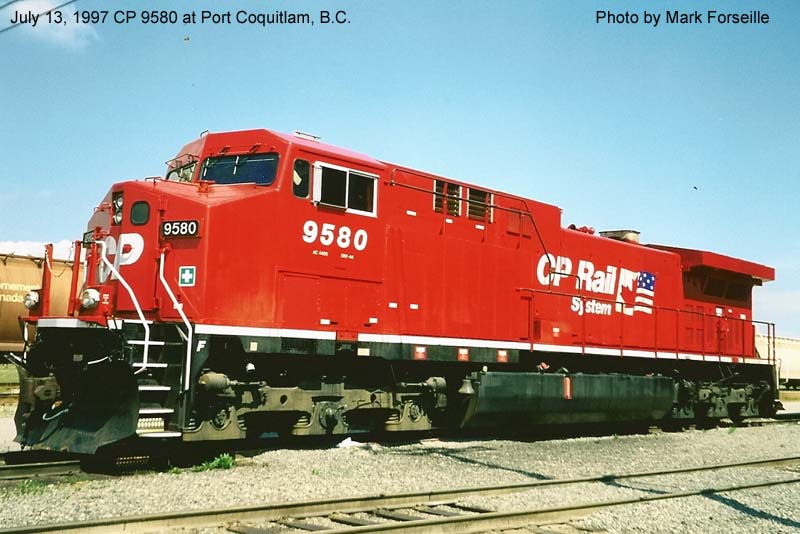 Other Photos (chronological) : 1. CP 9580 at Port Coquitlam, B.C., painted in the CP Rail Dual Flags paint scheme. Photo by Mark Forseille, 1997; 2. CP 9580 at Revelstoke, B.C., painted in the CP Rail Dual Flags paint scheme. Photo by W. van Schoonhoven, 2004; 3. CP 8057 at Winnipeg, MB., painted in the CPR Beaver II paint scheme. Photo by A. Ross Harrison, 2019.