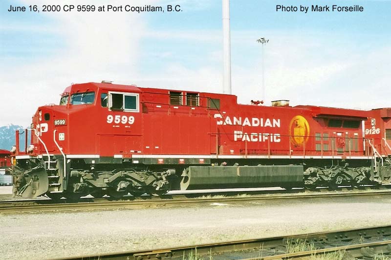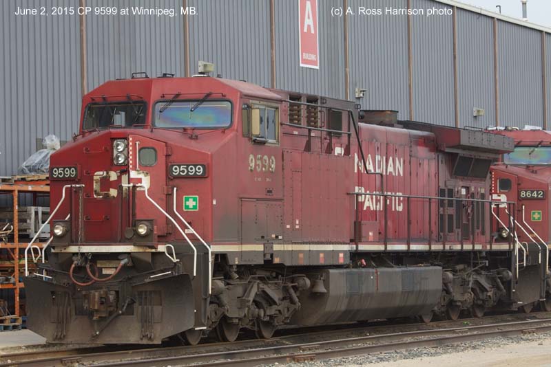 Other Photos (chronological) : 1. CP 9599 at Revelstoke, B.C., painted in the CPR Beaver paint scheme. Photo by Wilco van Schoonhoven, 2004; 2. CP 9599 at Winnipeg, MB., painted in the Canadian Pacific paint scheme. Photo by A. Ross Harrison, 2015.