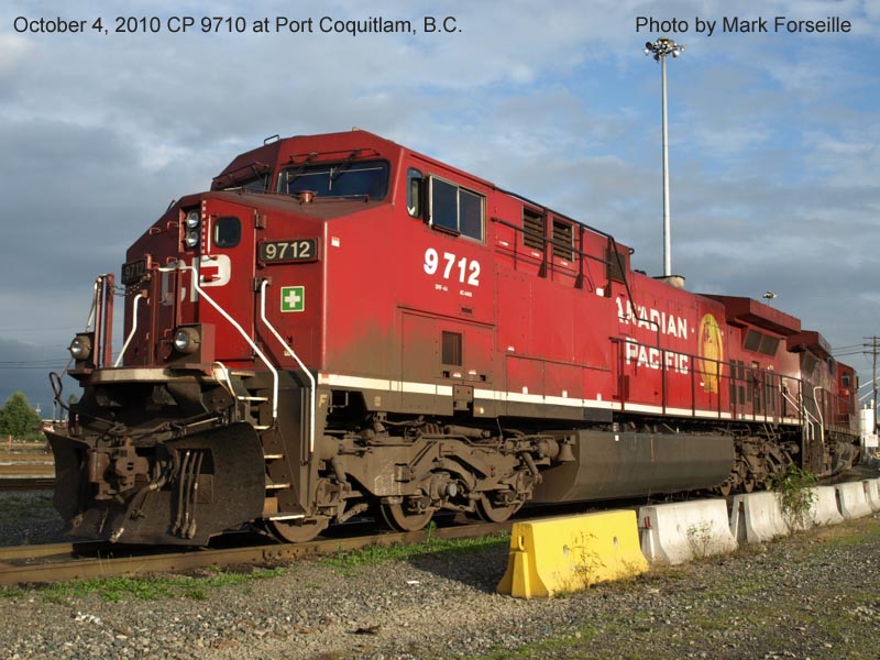 Other Photos (chronological) : 1. CP 9712 at Golden, B.C., painted in the CPR Beaver paint scheme. Photo by Mike McMahon, 2003; 2. CP 9712 at Port Coquitlam, B.C., painted in the CPR Beaver paint scheme. Photo by Mark Forseille, 2008; 3. CP 9712 at Port Coquitlam, B.C., painted in the CPR Beaver paint scheme. Photo by Mark Forseille, 2010.