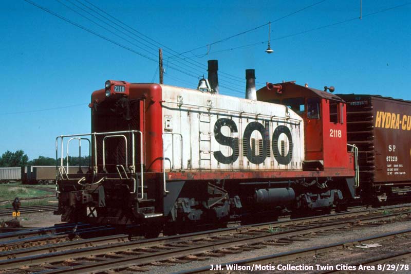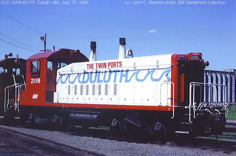 Other Photos (chronological) : 1. SOO 2118 in the Twin Cities area, MN., painted in the SOO Red/White paint scheme. Photo by J.H. Wilson, 1978. From the E.D. Motis collection; 2. SOO 2118 at Duluth, MN., painted in a special Twin Ports paint scheme. Photo by John C. Benson, 1980. From the Bill Sanderson collection; 3. SOO 2118 at Minneapolis, MN., painted in the SOO Red paint scheme. Photo by Bob Heathorn, 1996. From the Bill Sanderson collection.